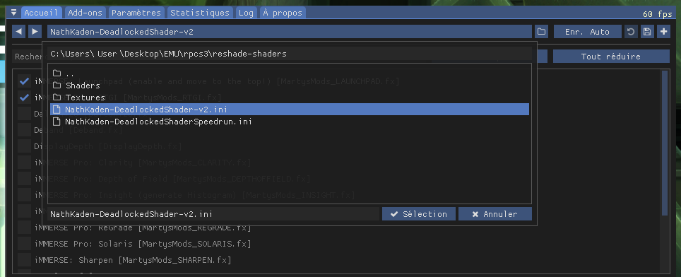 Ce fichier, on peut le mettre quelque part, où on pourra le retrouver plus tard. Personnellement, je les mets dans le dossier reshade-shaders.